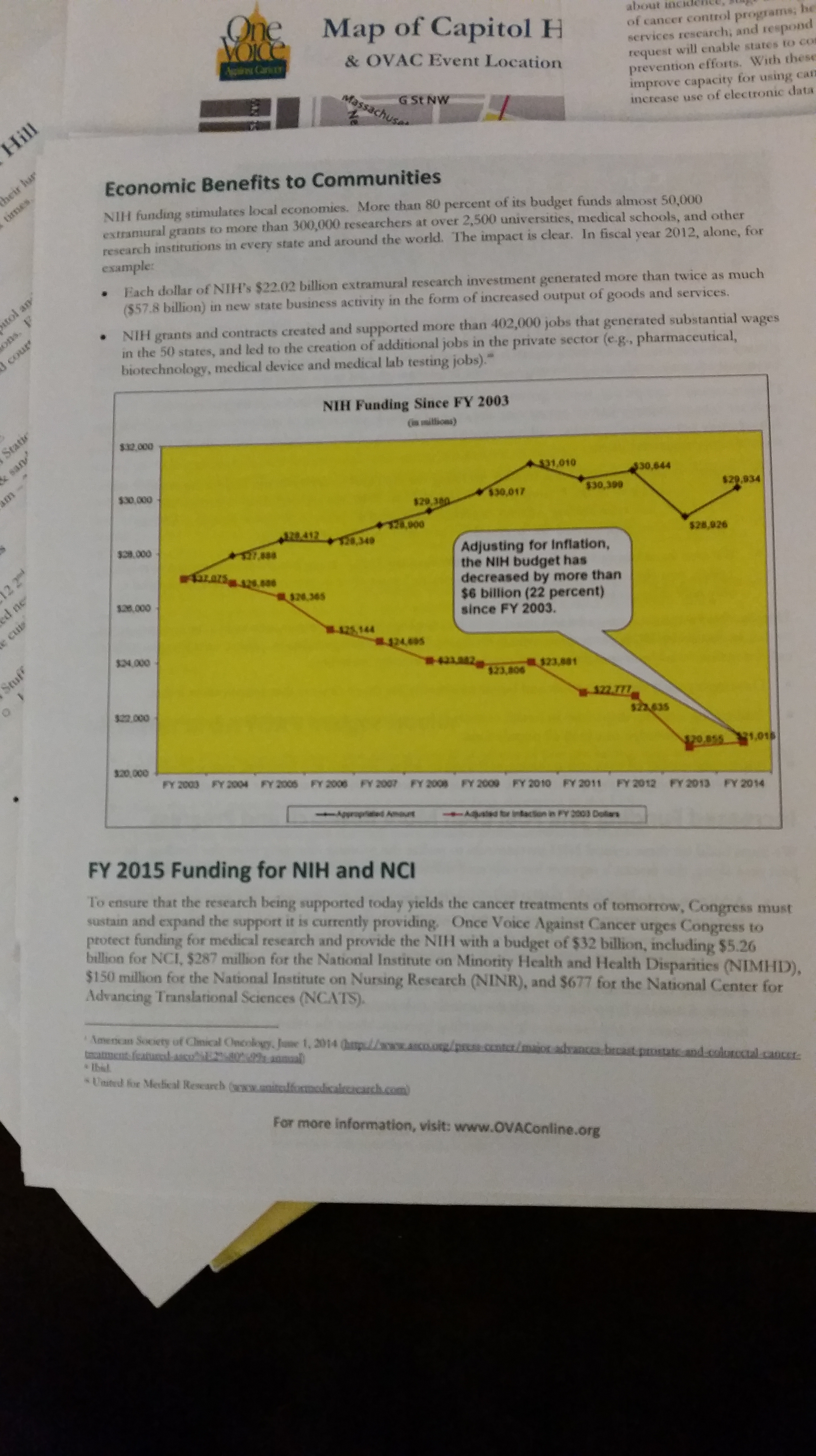 After getting to know one another we went in to begin our training. https://www.flickr.com/photos/96126987@N00/14654799465/in/set-72157645186462238There were 88 participants from 30 states, and I’d say about 1/2 of us are newbies, so I was not completely alone 🙂 During training we were given 3 very specific goals, or asks; the end goal is of course making cancer research and prevention a top priority, thereby finding better treatment options, and hopefully cures. Specifically though we were asking for 1) $5.26 billion to be provided for the National Cancer Institute (NCI) 2) to ensure a proportional increase to NCI’s funding when there is an increase in the NIH’s funding, and 3) $510 million to be budgeted for the CDC Division of Cancer Prevention and Control.